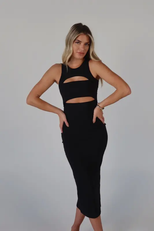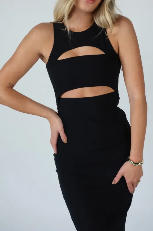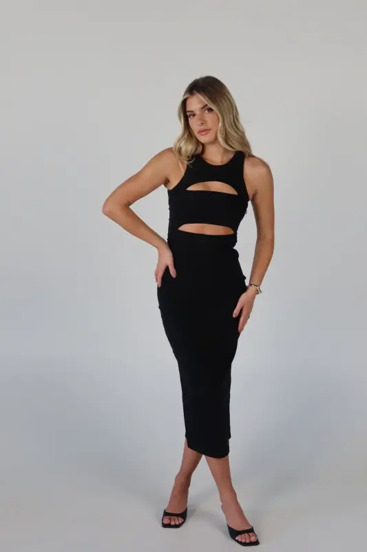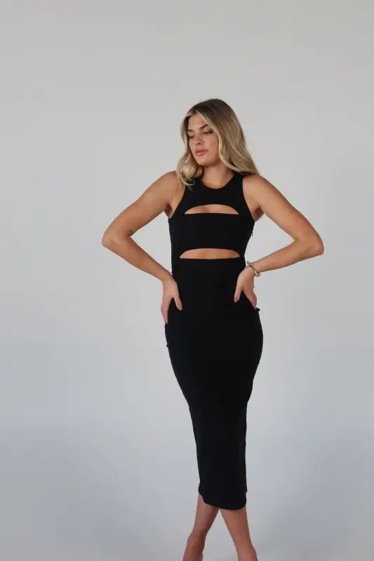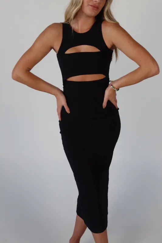 Make a statement with our Blair Cut-Out Midi Dress in Black, a perfect blend of sophistication and edge. Designed in a classic black color, this sleek midi-length dress features a stylish cut-out detail that adds a modern twist to a timeless silhouette. The sleeveless design keeps it effortlessly chic, while the button closure at the back ensures a secure and flattering fit. Whether you're heading to a special event or a night out, this dress is your go-to for turning heads with its bold, fashion-forward look.
