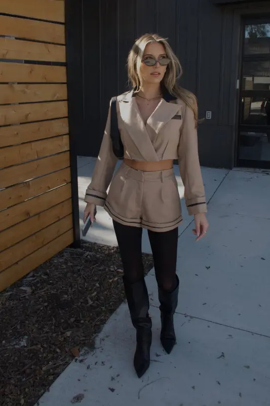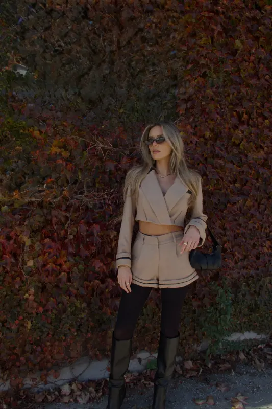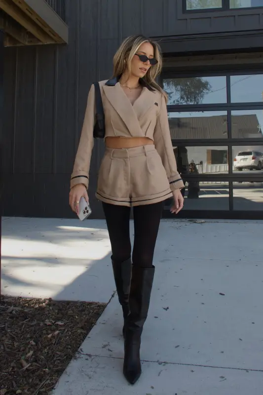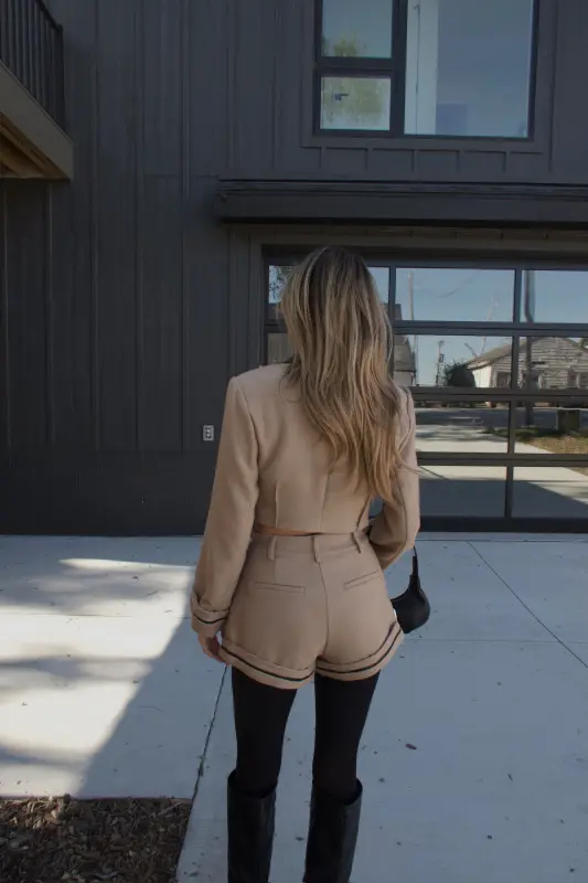 Tailored, chic, and effortlessly modern — the Brooklyn Structured Woven Shorts bring a polished edge to your fall wardrobe. Designed in a rich khaki tone with sleek black PU leather trim, these shorts combine timeless tailoring with a contemporary twist. The structured woven fabric gives them a refined, elevated look while maintaining all-day comfort and versatility.
