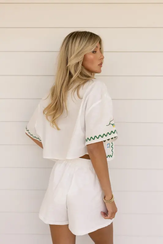 Elevate your wardrobe with the Cabo Embroidered Button Down Shirt and Shorts Set. This vibrant linen set features intricate, colorful embroidery for a unique, vacation-ready look. The collared button-down top is cropped and adorned with floral and curvy trim, while the fully-lined shorts have an elastic waistband for a comfortable fit. Both pieces showcase matching embroidered detailing, making this set a must-have for effortless summer style.