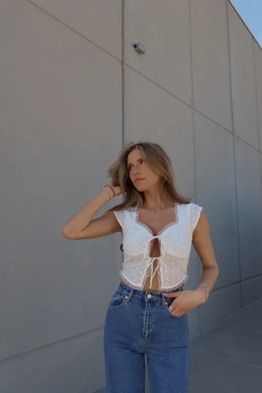 The Clara Eyelet Tie Top in White is a timeless spring staple with a touch of elegance. This cropped eyelet top features delicate lace trim detailing, a charming sweetheart neckline, and a front double tie closure for an adjustable, snug fit. With a double-lined bust for added comfort, it’s perfect for any occasion—dress it down with denim or elevate your look with a skirt. Whatever your spring plans, the Clara Top is here to make a statement!