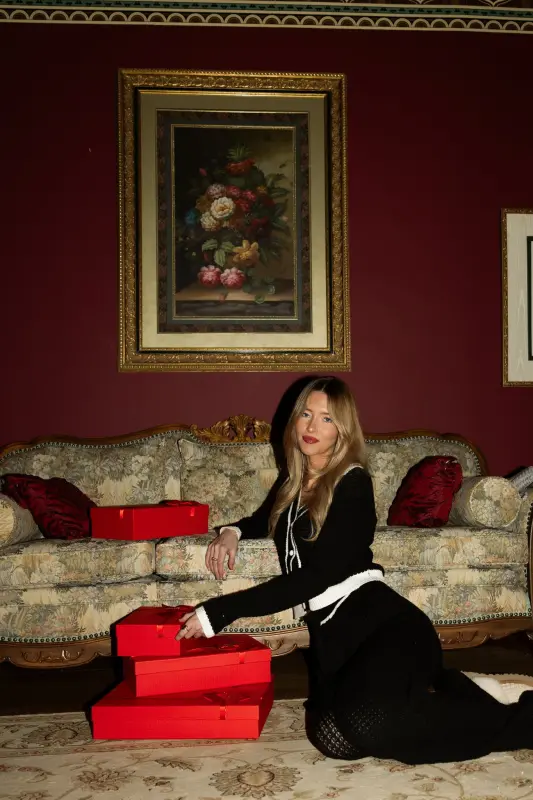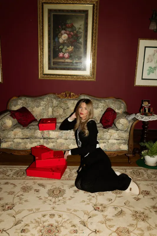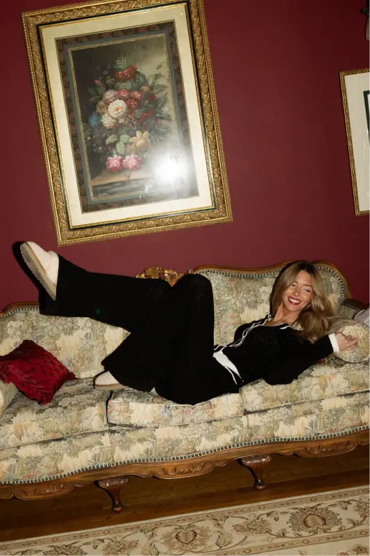 Two-tone knit cardigan in black and cream. Features classic collar, four-button closure, and long sleeves.