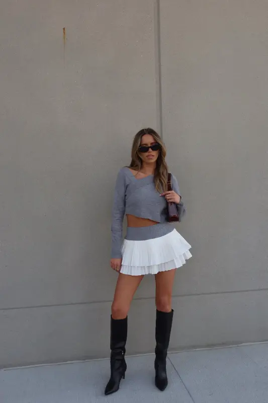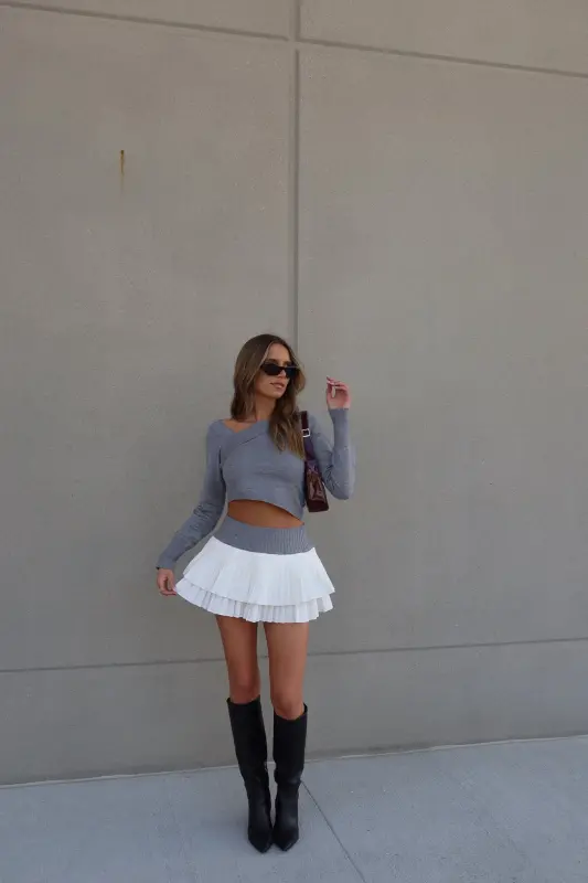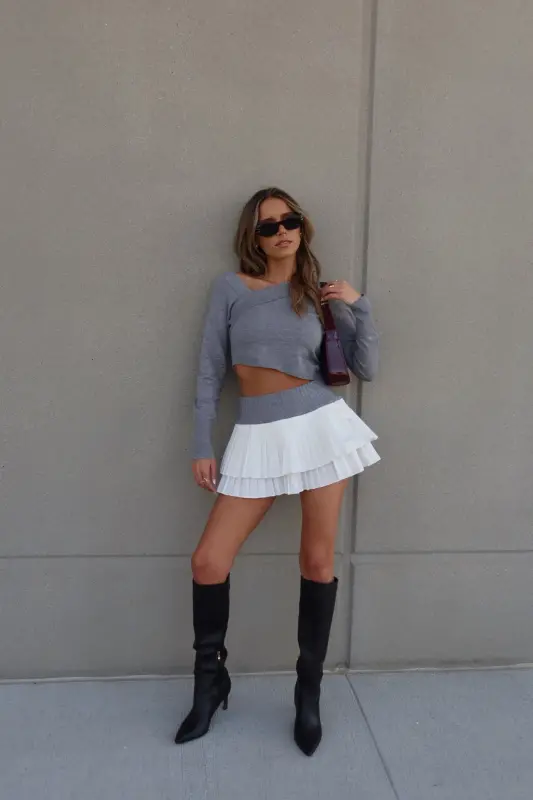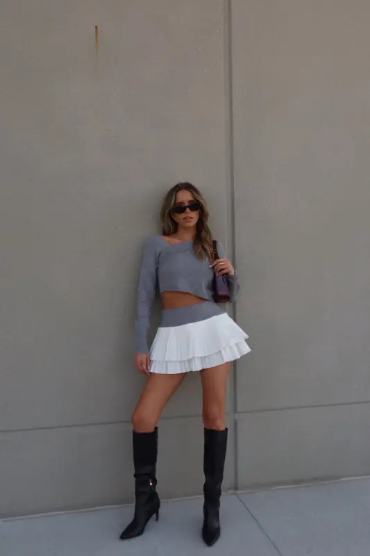 Turn heads with the Edgy Elegance Asymmetric Sweater & Ruffled Skirt Set. This chic two-piece features a stylish asymmetric sweater crop top that combines comfort with a contemporary edge. Its unique cut offers a bold silhouette, perfect for making a fashion-forward statement. Paired with a contrast ruffled mini skirt, this set exudes feminine flair with its playful ruffle detailing and flattering fit. Ideal for a night out or a stylish daytime look, this set effortlessly blends modern design with playful elegance. Wear them together for a complete standout ensemble or mix and match for versatile styling.