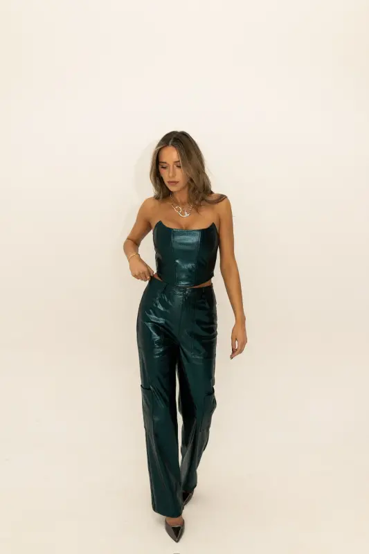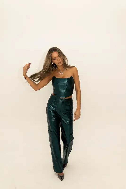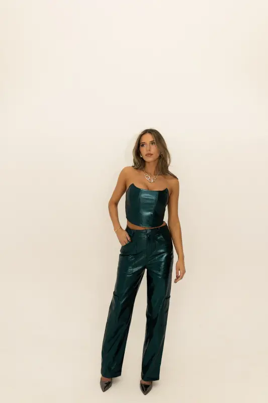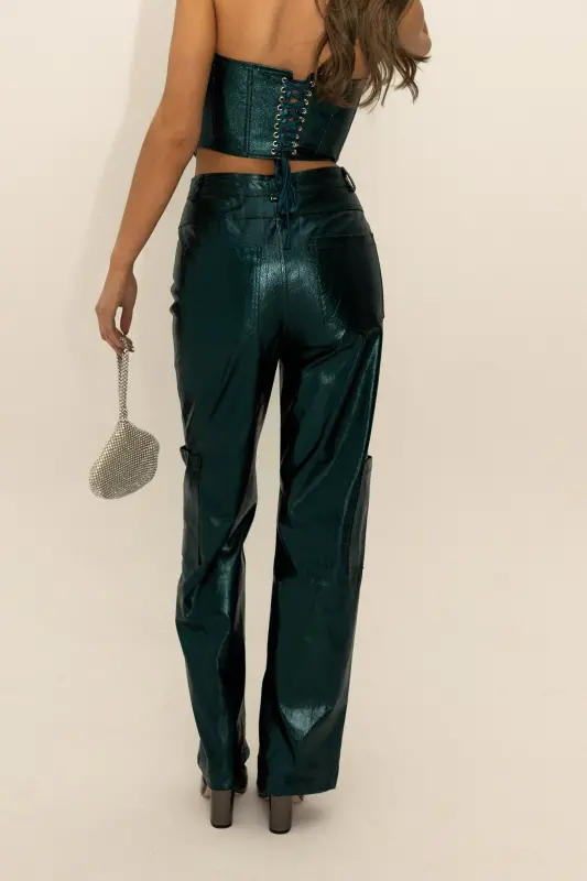 Our Gaia Teal Metallic Cargo Pants are a bold and luxurious piece that adds edge to any outfit. Made from high-quality vegan leather with a striking metallic finish, these statement pants feature , high rise waistline, functional cargo pocket and belt loops. Perfect for adding a touch of glamour and confidence to your wardrobe, the Gaia Corset Top is a statement piece that can easily be dressed up or down for any occasion.