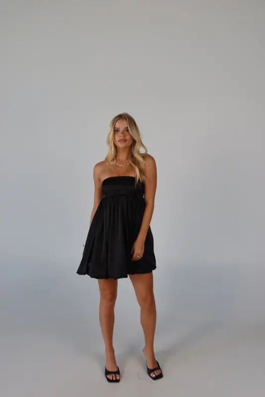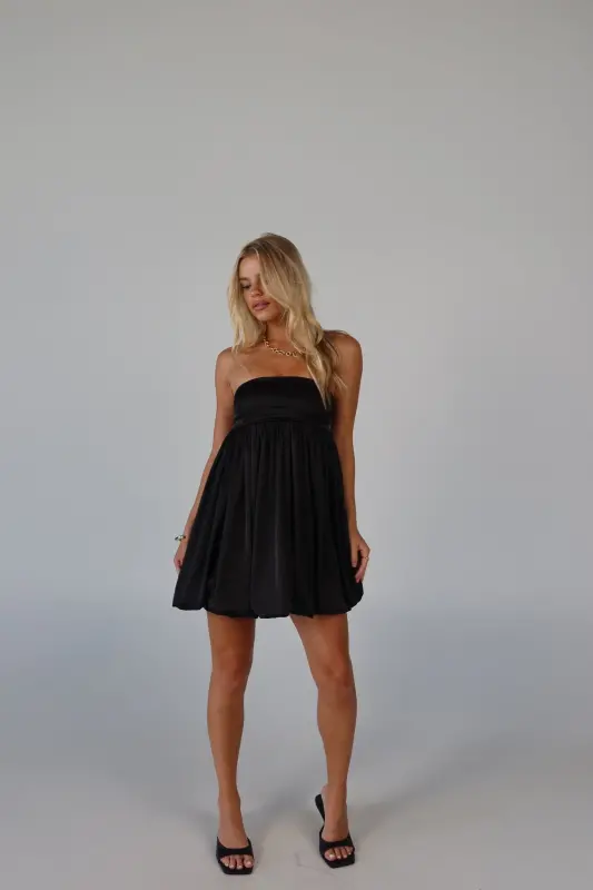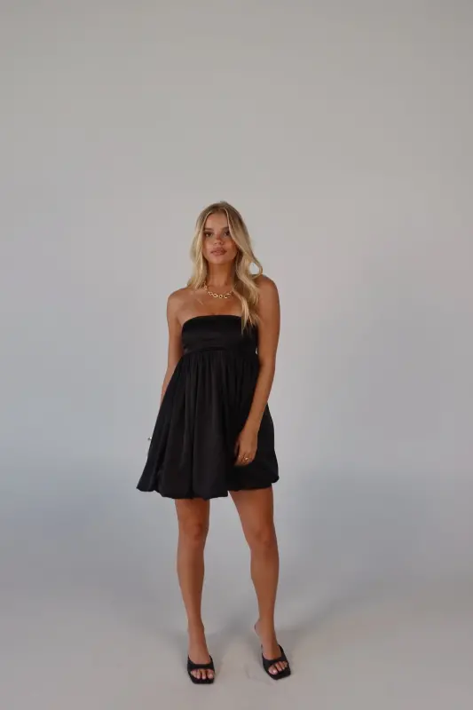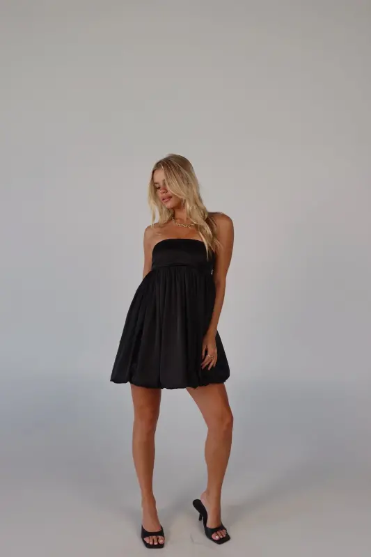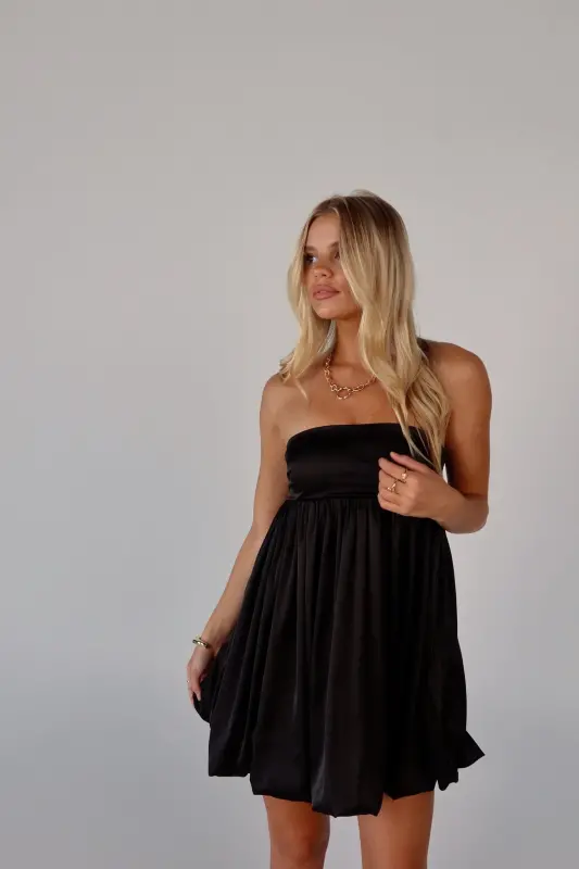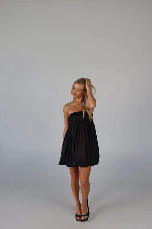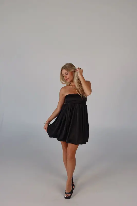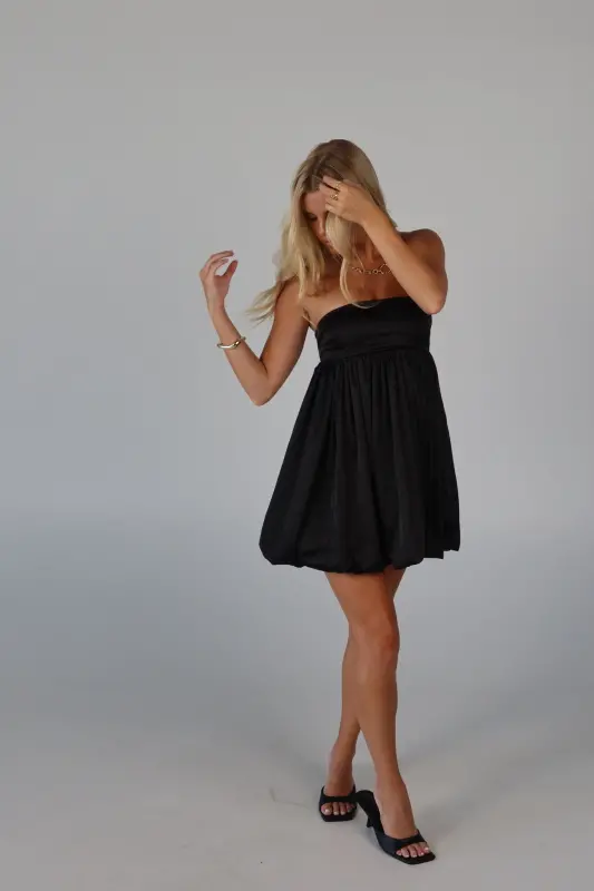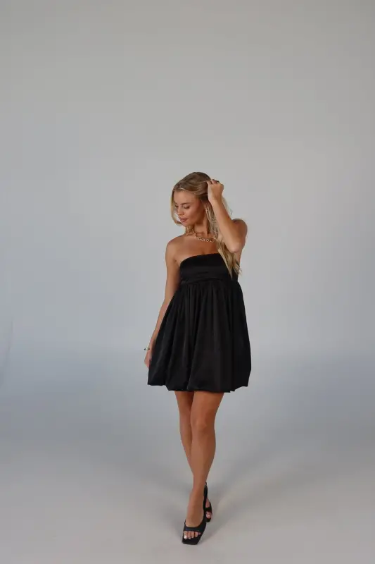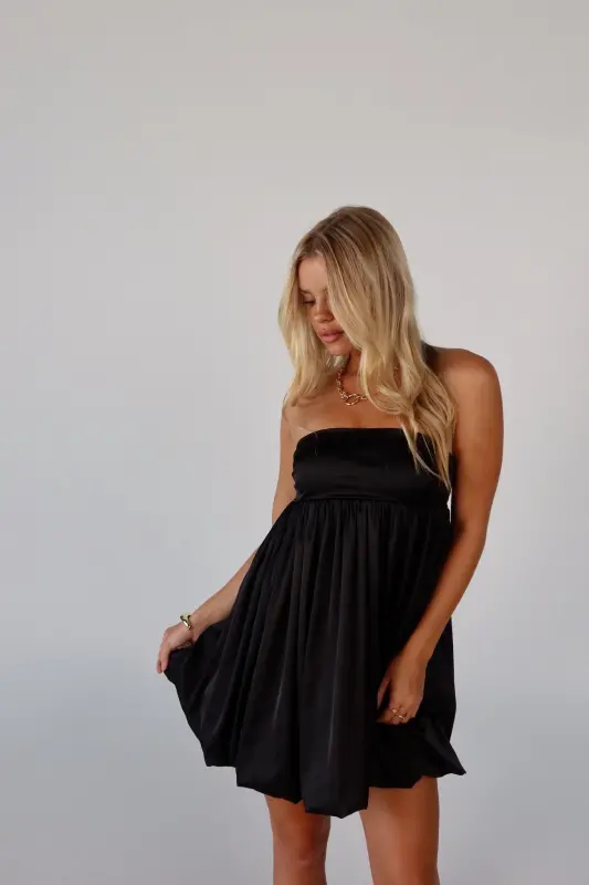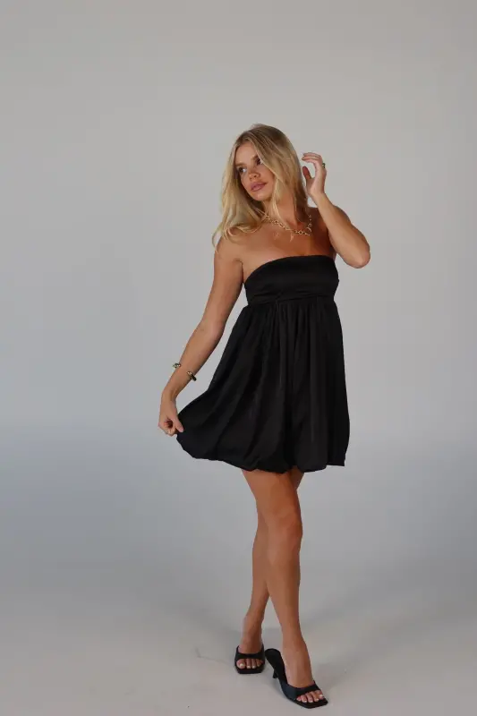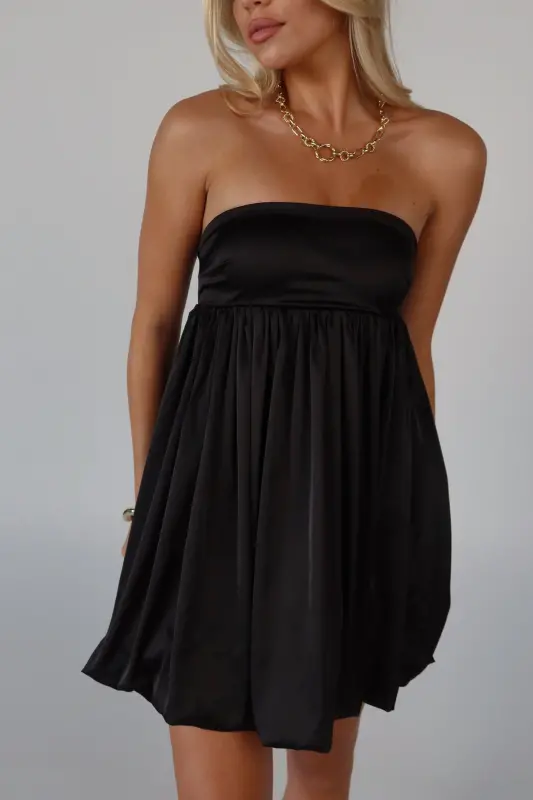 Elevate your wardrobe with this strapless bubble dress, an irresistible blend of playful charm and sophistication. Crafted from luxurious satin, this mini dress boasts a sleek, soft feel that makes it perfect for any occasion. The strapless design features a no-slip grip on the neckline to ensure a secure fit, while the smocked back on the bustline adds a touch of comfort and flexibility. Whether you're attending a special event or enjoying a night out, this adorable piece promises to make a stylish statement.