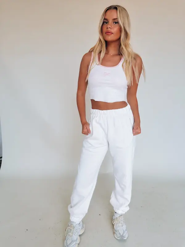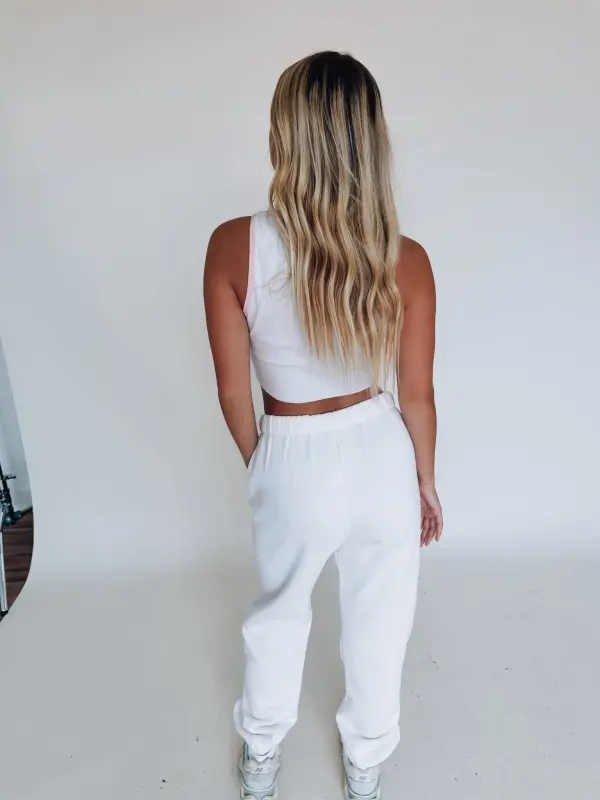 Our Naomi Joggers In White are the ultimate comfy jogger. These joggers feature a stretchy elastic waistline, functional front pocket detail, and elastic ankle detail. These joggers have an oversized fit and have the softest lining. These sweatpants joggers fit true to size and have some stretch throughout.